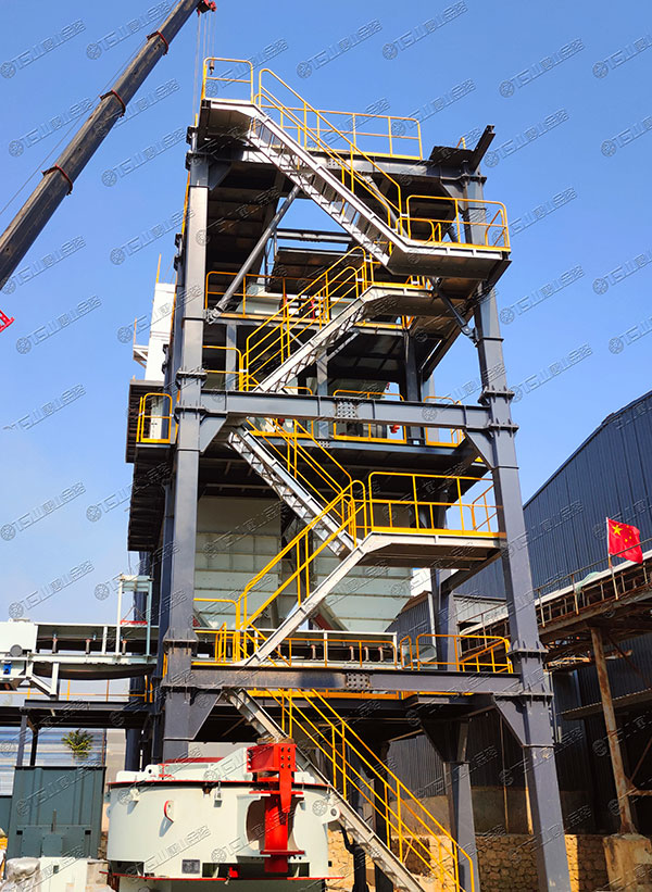 這套V9-150制砂樓,總投料量為150噸,整條生產(chǎn)線設備選型為:制砂選粉一體機、空氣篩、粗細粉分離機等。