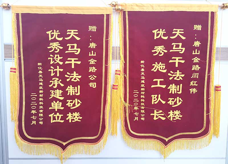 近日,天馬建筑項目負責人將兩面印有“天馬干法制砂樓,優(yōu)秀設計承建單位”、“天馬干法制砂樓,優(yōu)秀施工隊長”的錦旗送到了唐山金路安裝隊長閆紅偉的手上。
