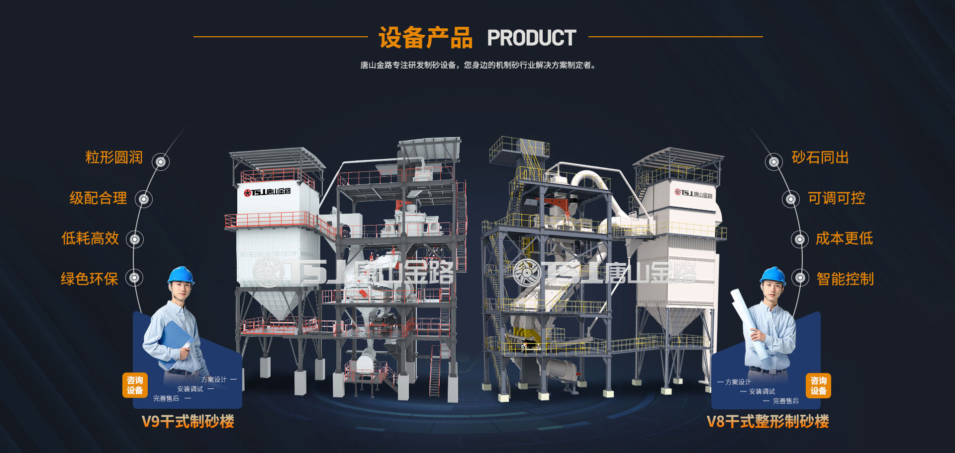 唐山金路作為一家集研發(fā)、生產、銷售、服務于一體的制砂機械設備企業(yè),一直致力于環(huán)保型破碎制砂設備的研發(fā)與生產,現建有年產100萬噸的機制砂生產實踐基地。公司自主研發(fā)的V8干式整形制砂樓、V9干式制砂樓,具有綠色環(huán)保、能耗低產量高、智能控制等特點,產出的機制砂級配合理、粒形圓潤,是制砂生產企業(yè)的理想產品。
